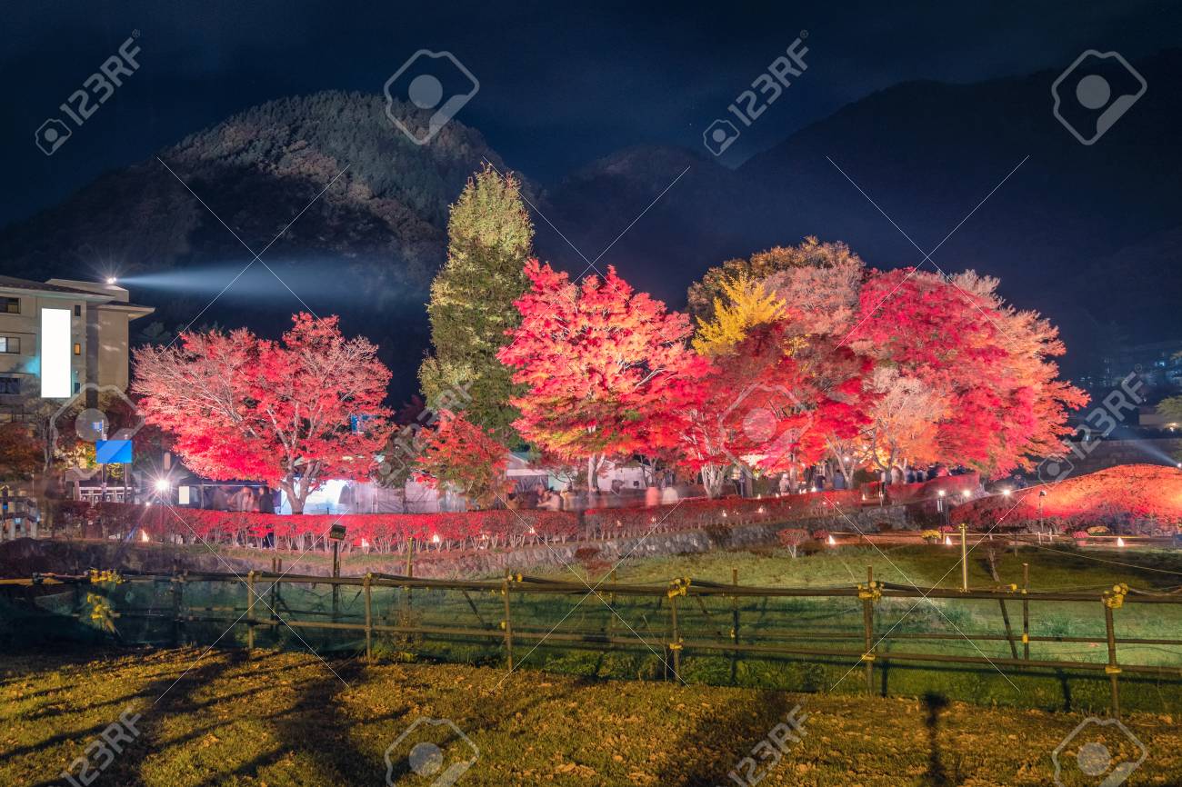 Red Maple Tree In Autumn Garden With Festival Light Up